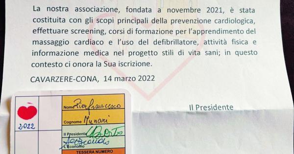“L’associazione che promuove tutto questo, organizza anche corsi di formazione per l’utilizzo dei defibrillatori, effettua screening e promuove una serie di attività importantissime per i nostri cittadini - prosegue Munari - invito tutti a scoprire questa organizzazione di volontariato e ad aderire alle loro iniziative”. “Ringraziamo il sindaco per la disponibilità e l’interesse dimostratoci - ha commentato Giorgio Berto, presidente dell’associazione - sono stati apprezzati gli scopi e gli obiettivi che sono nei nostri programmi e, ove possibile, sarà al nostro fianco”. Nella lettera di accompagnamento, i soci de “Il cuore per amico” hanno sottolineato di essere “lieti di consegnarle la tessera onoraria. La nostra associazione, fondata a novembre 2021, è stata costituita con gli scopi principali della prevenzione cardiologica, effettuare screening, corsi di formazione per l’apprendimento del massaggio cardiaco e l’uso del defibrillatore, attività fisica e informazione medica nel progetto stili di vita sani. In questo contesto ci onora la sua iscrizione”.