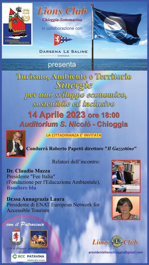 CHIOGGIA - Il Lions Club Chioggia Sottomarina, in collaborazione con la darsena Sporting Club Le Saline e con il Patrocinio del Comune di Chioggia ha organizzato un incontro per parlare di turismo, nell'ottica della sosteniblità e dell'inclusione. L'evento, dal titolo "Turismo, Ambiente e Territorio - Sinergie per uno sviluppo economico, sostenibile ed inclusivo" è previsto per il giorno 14 aprile alle ore 18.00, presso l'Auditorium San Nicolò.