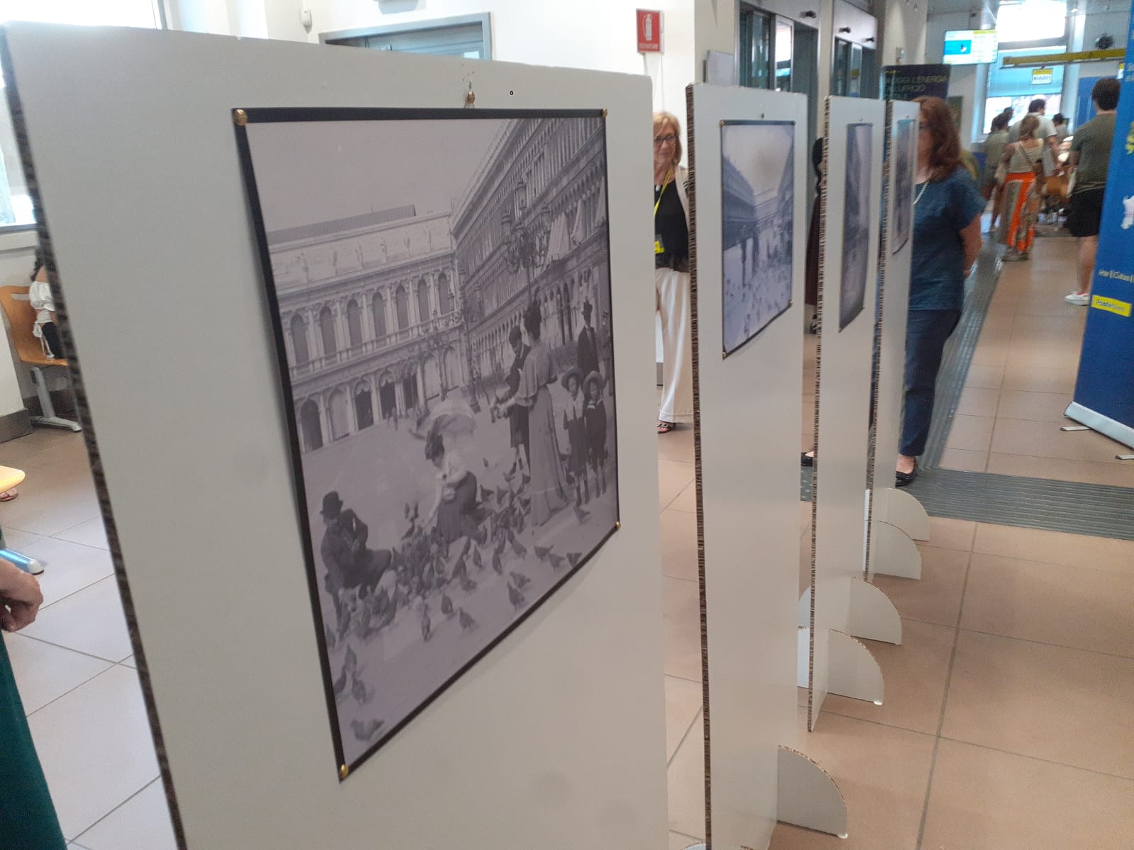 Il materiale esposto per la prima volta al pubblico nell'atrio dell'Ufficio Postale racconta attimi di vita dei veneziani di un secolo fa, fissati nelle cartoline realizzate dalla celebre azienda triestina Modiano. Distinti signori a passeggio col bastone, dame con ampie gonne e cappellini infiorati, bambini che giocano, uomini al lavoro, pittrici e mendicanti sullo sfondo dei luoghi più celebri di Venezia. È una città viva e affollata, per niente appagata dei suoi monumenti, per niente rassegnata ad essere museo di sé stessa.