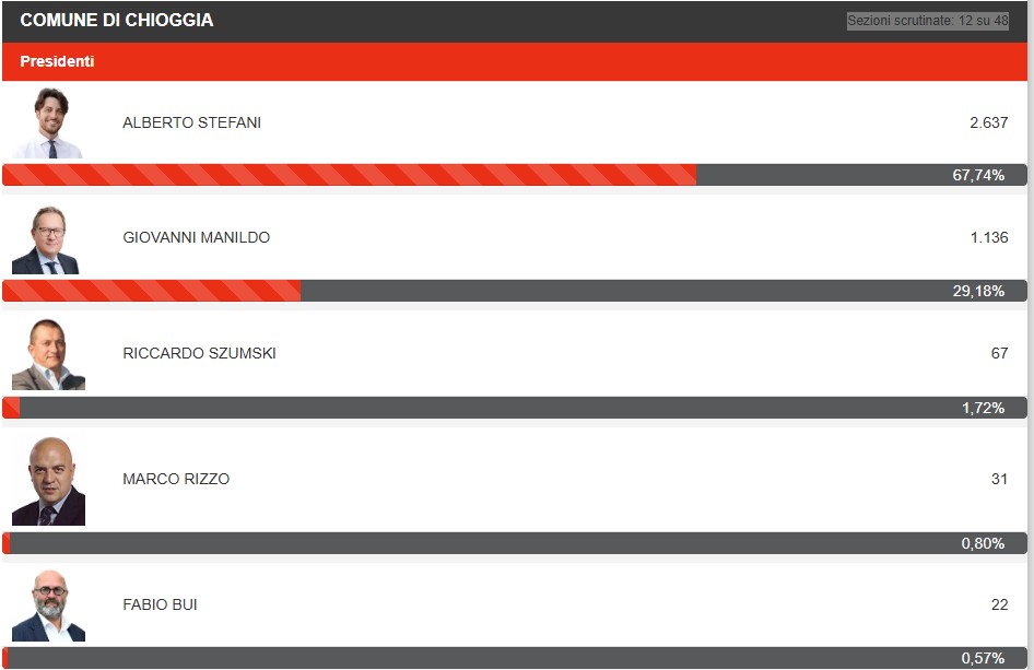 Sul fronte dello scrutinio, ancora in corso, sono state scrutinate 12 sezioni su 48. Il quadro che emerge per ora vede in netto vantaggio Alberto Stefani, che guida con un 67,74% dei consensi. Segue Giovanni Manildo con il 29,18%. Più distaccati gli altri candidati: Riccardo Szumski al 1,72%, Marco Rizzo allo 0,80% e Fabio Bui allo 0,57%.
