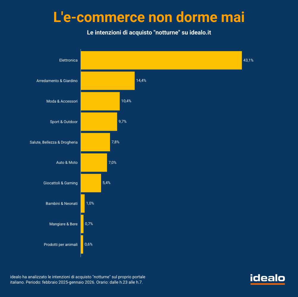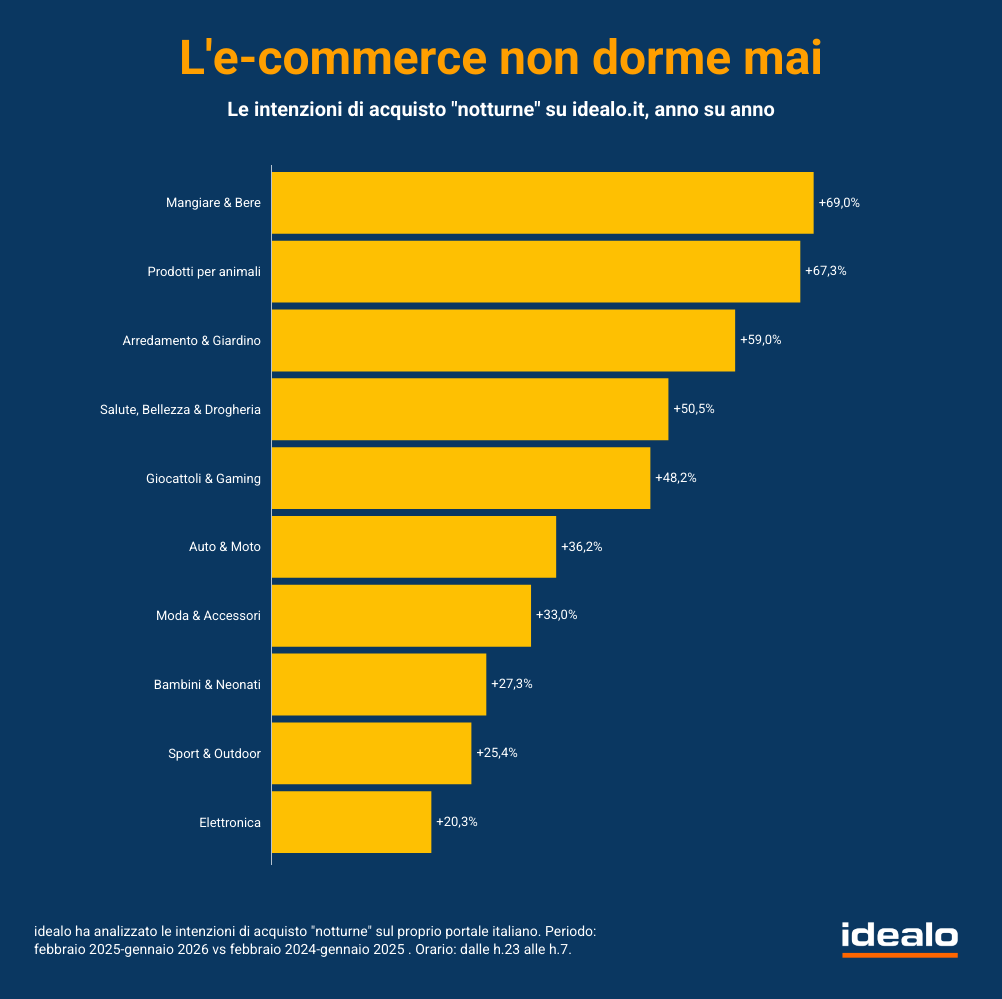 VENEZIA - Le notti degli italiani sono sempre più corte e sempre più digitali: si dorme meno, ma si naviga di più e, soprattutto, si fanno acquisti online. Secondo un’analisi del portale internazionale di comparazione prezzi idealo, le intenzioni di acquisto nella fascia oraria tra le 23 e le 7 del mattino sono aumentate del 32% nell’ultimo anno, trasformando le ore notturne in un nuovo spazio di consumo, pianificazione e interessi personali.