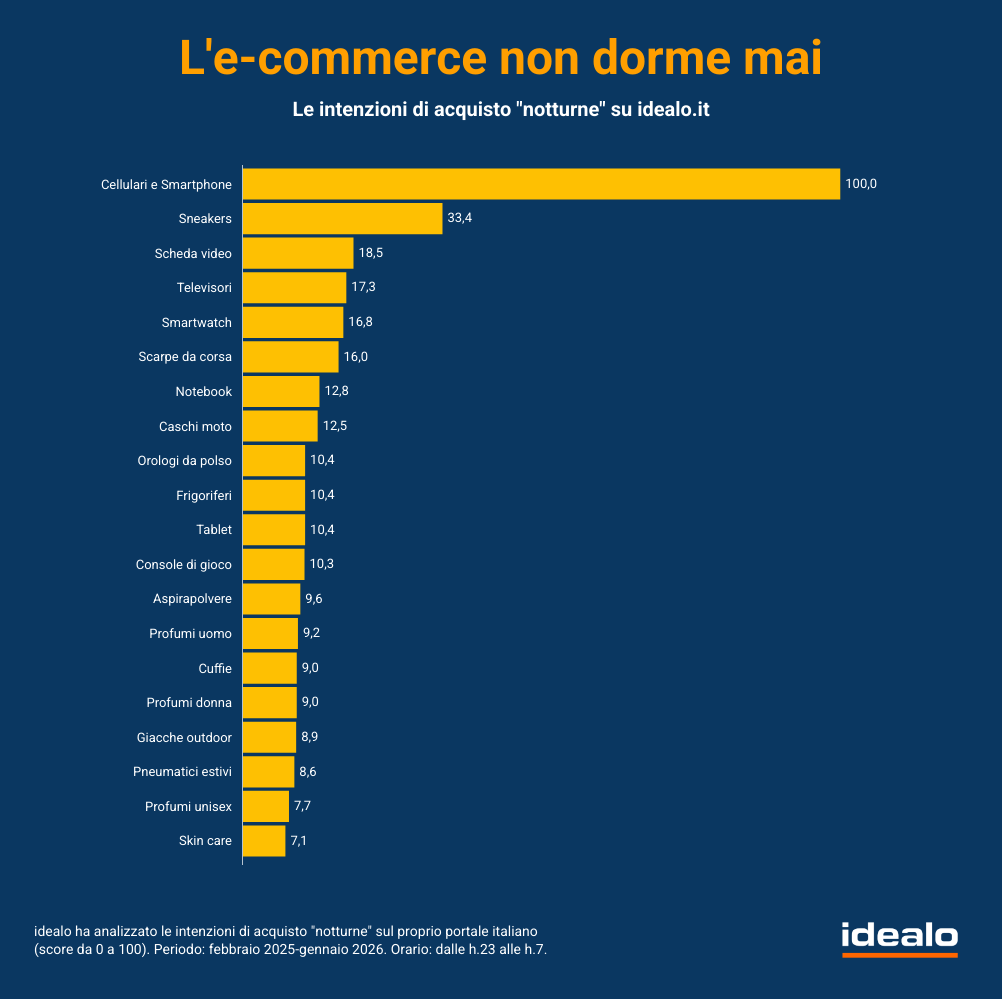L’analisi evidenzia come la navigazione notturna resti fortemente legata all’utilizzo dello smartphone, confermando una tendenza mobile-first. L’elettronica concentra infatti il 43% dell’interesse notturno e lo smartphone resta il prodotto più cercato, anche se registra un leggero calo del 6% rispetto all’anno precedente.