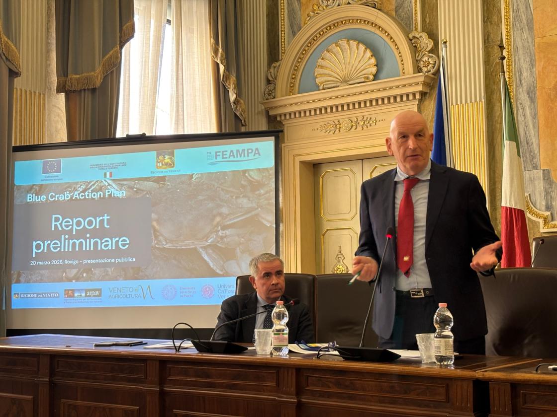 VENEZIA - Un anno dopo l’avvio del progetto “Mappatura ambientale ed eco-fisiologica del granchio blu nelle acque interne e marittime del Veneto (Blue Crab Action Plan)”, la Regione del Veneto ha fatto il punto sui risultati intermedi di un programma strategico nato per fronteggiare una delle emergenze ambientali, economiche e sociali più significative degli ultimi anni. La conferenza stampa si è svolta a Rovigo, con la partecipazione dell’assessore regionale alla pesca Dario Bond, del commissario straordinario nazionale per il granchio blu Enrico Caterino, del direttore di Veneto Agricoltura Federico Caner, della dottoressa Franca Baldessin di Arpav, oltre a docenti e ricercatori delle università di Padova e Ca’ Foscari Venezia coinvolte nel progetto. Presenti anche i rappresentanti della Fondazione Cassa di Risparmio di Padova e Rovigo, il consigliere regionale Cristiano Corazzari, il presidente della Provincia di Rovigo Enrico Ferrarese, tecnici di Arpav, sindaci dei Comuni costieri e lagunari, nonché organizzazioni professionali della pesca e acquacoltura, cooperative e consorzi.