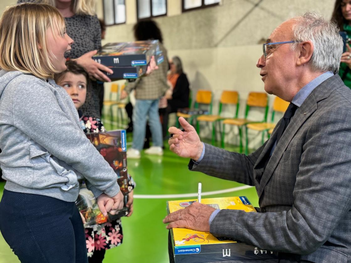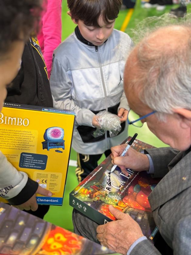 Oltre alle copie destinate alla scuola, ciascun bambino e docente ha ricevuto un’edizione personale del gioco, impreziosita dall’autografo di Stefano Clementoni, presente alla cerimonia.