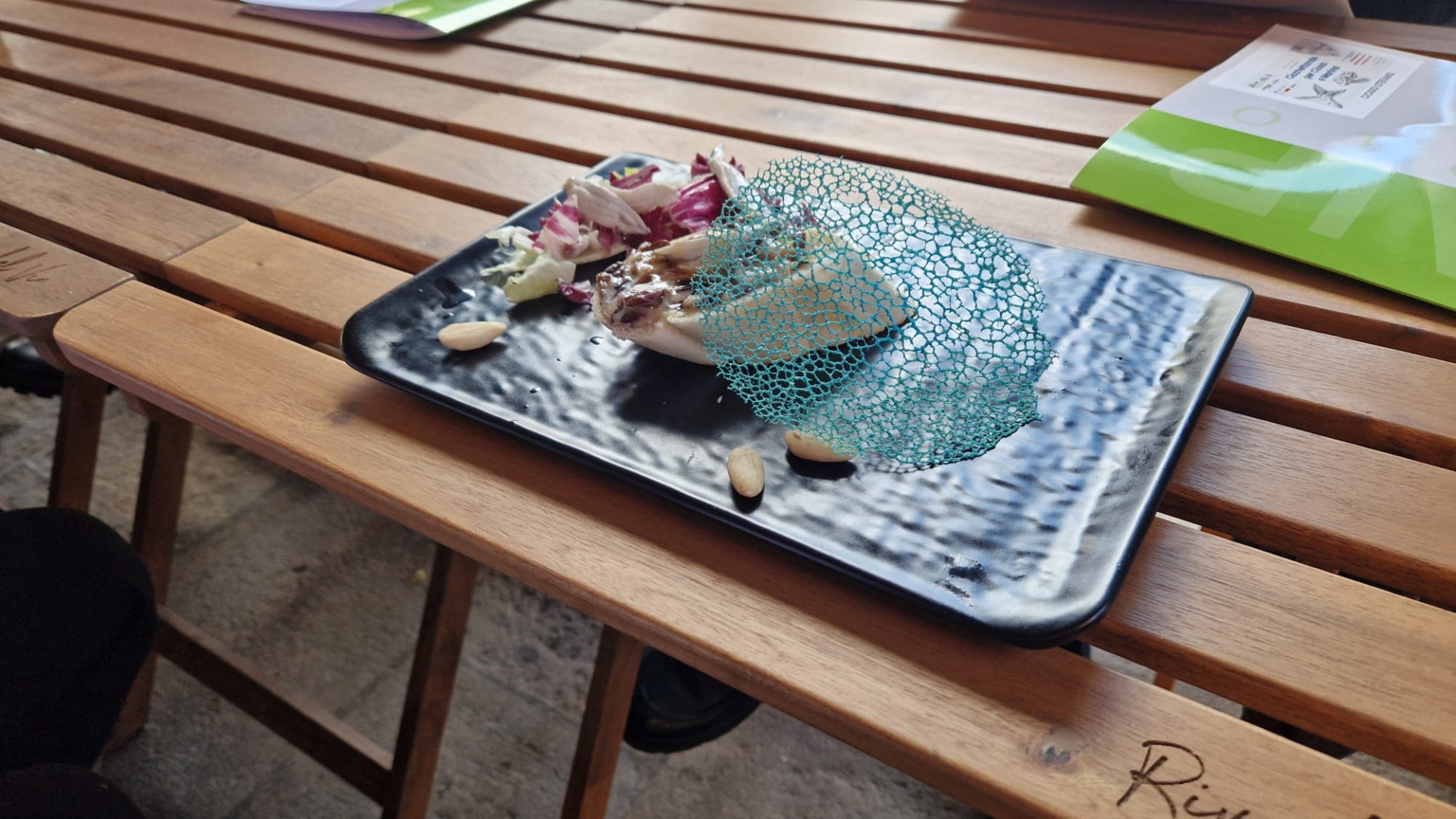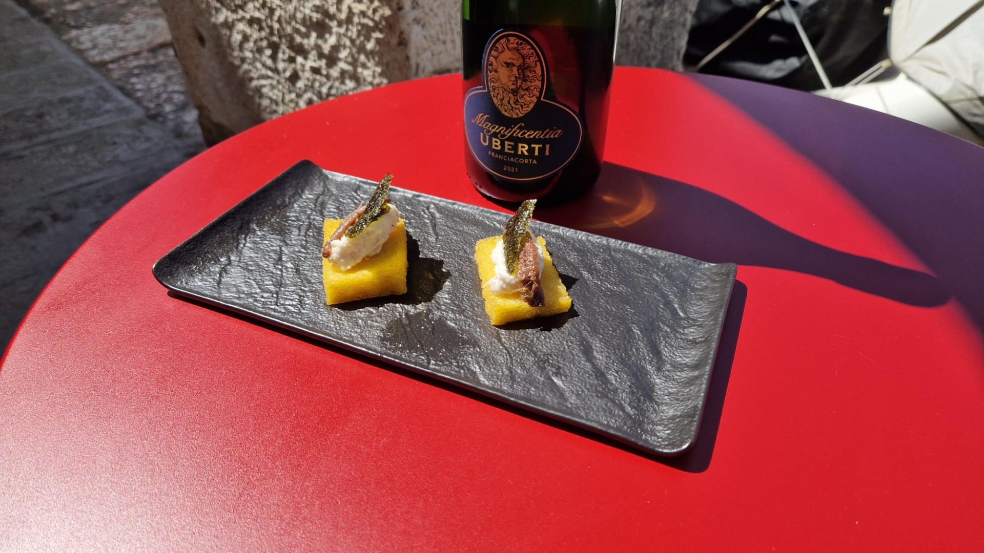 La terza tappa ha portato la giuria al bacaro “80 fame e sete”, dove è stato presentato il cicchetto “Crunch di Laguna”, a base di polentina fritta, baccalà mantecato, acciuga al radicchio e alga spirulina, abbinato a Franciacorta Satèn Uberti.