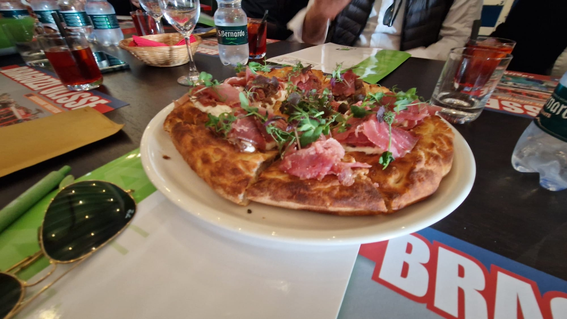 A chiudere il bacaro “Do Lire”, con il cicchetto “Ci devo pensare”, pensato per cinque persone: una pizza con farine di riso e segale, tonno affumicato, burrata, cipolla caramellata e olio di oliva, accompagnata da un cocktail in versione americano con Martini, Select e ginger beer.