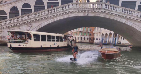 VENEZIA - Incuranti delle regole e dei pericoli del Canal Grande e del suo traffico, due giovani si sono divertiti a surfare tra vaporetti e gondole in centro a Venezia questa mattina 17 agosto. Si tratta di surf a motore, che hanno sfrecciato e sono stati filmati.