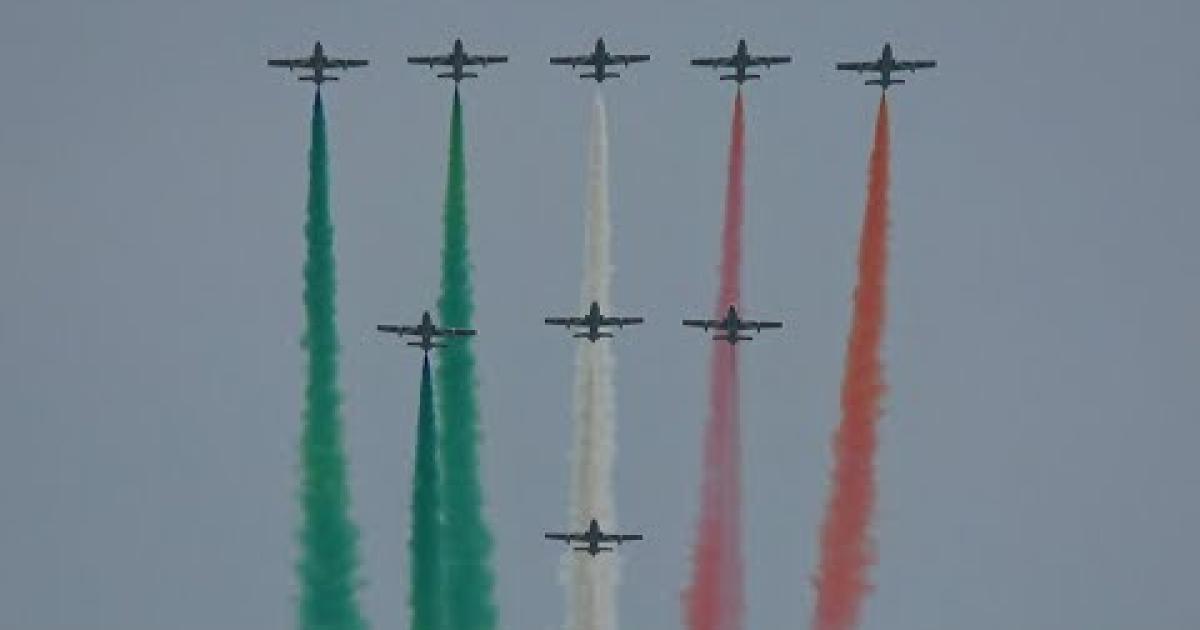 Le Frecce Tricolori, conosciute in tutto il mondo per le loro spettacolari esibizioni e per la precisione acrobatica dei loro piloti, hanno effettuato una prova generale, disegnando nel cielo limpido le inconfondibili scie di fumo verde, bianco e rosso, a rappresentare il tricolore italiano.